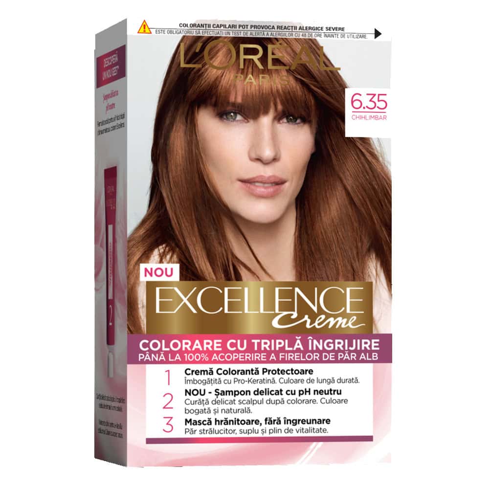L’Oréal Excellence 6.35 Chihlimbar Ciocolată este o nuanță intensă, caldă, cu reflexe chihlimbarii bogate și tonuri de ciocolată. Aceasta oferă un look elegant, bogat în profunzime.