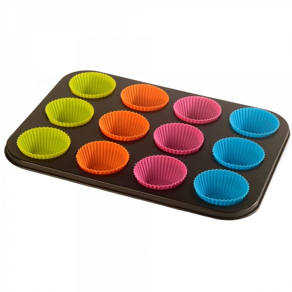 Tava pentru copt brioșe, însoțită de 12 forme din silicon, este ideală pentru prepararea uniformă a deserturilor de tip muffin sau brioșă, atât pentru uz casnic, cât și pentru ocazii speciale.